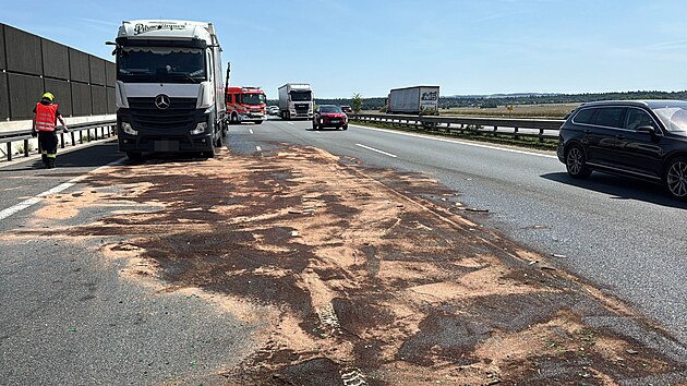 Před Prahou na dálnici D1 došlo k dopravní nehodě dvou kamionů, z jednoho vypadl náklad s pivem. (7. srpna 2025)