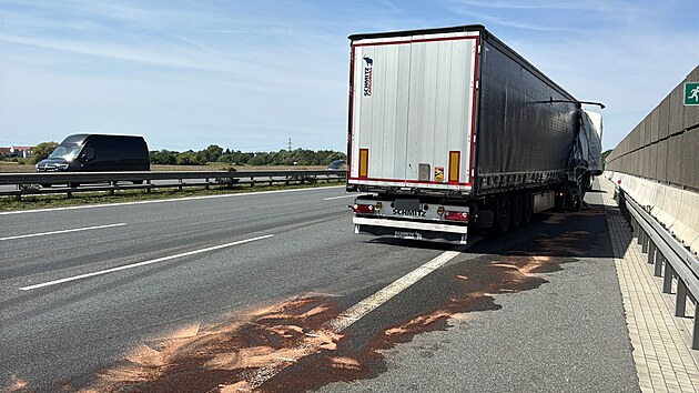 Před Prahou na dálnici D1 došlo k dopravní nehodě dvou kamionů, z jednoho vypadl náklad s pivem. (7. srpna 2025)