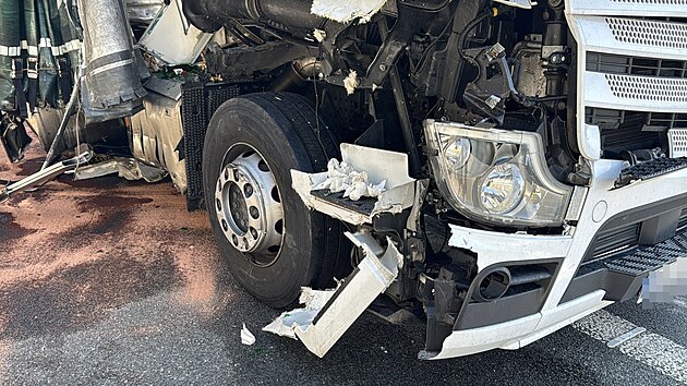 Před Prahou na dálnici D1 došlo k dopravní nehodě dvou kamionů, z jednoho vypadl náklad s pivem. (7. srpna 2025)