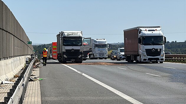 Před Prahou na dálnici D1 došlo k dopravní nehodě dvou kamionů, z jednoho vypadl náklad s pivem. (7. srpna 2025)