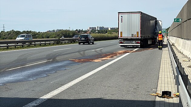 Před Prahou na dálnici D1 došlo k dopravní nehodě dvou kamionů, z jednoho vypadl náklad s pivem. (7. srpna 2025)