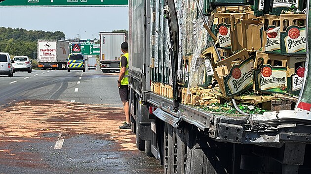 Před Prahou na dálnici D1 došlo k dopravní nehodě dvou kamionů, z jednoho vypadl náklad s pivem. (7. srpna 2025)