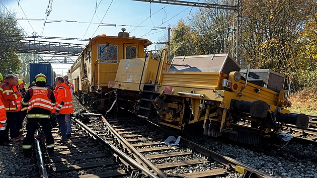Železničářská podbíječka se v Praze srazila s nákladním vlakem.