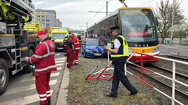 Nehoda osobního auta a tramvaje v Olšanské ulici v Praze. (13. dubna 2025)