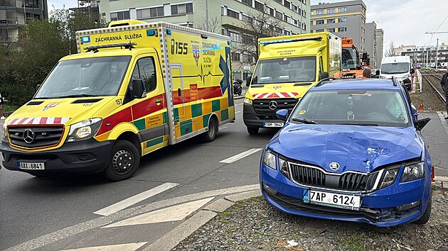 Nehoda osobního auta a tramvaje v Olšanské ulici v Praze. (13. dubna 2025)