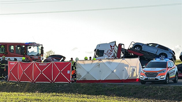 Nehoda osobního a nákladního vozidla na silnici 16 u obce Žižice u Kladna. (12. září 2025)