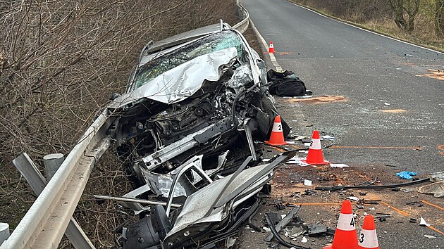 Nehoda dvou automobilů u Nučic. Řidiči se čelně střetli, když jeden z nich vjel do protisměru. (27. ledna 2025)