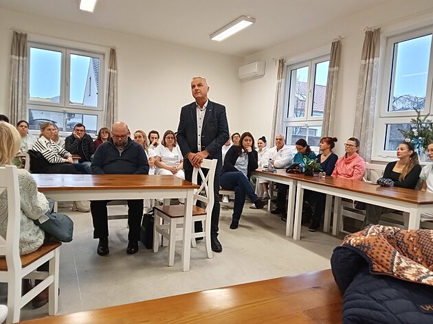 Radní Nymburka se vydali do tamní nemocnice s cílem zklidnit rozjitřené vášně. Na snímku mluví starosta města Tomáš Mach (Nymburk s klidem). (10. prosince 2024)