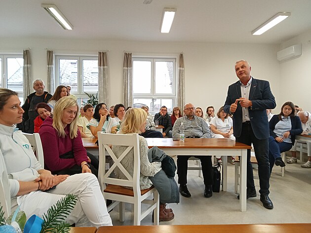 Radní Nymburka se vydali do tamní nemocnice s cílem zklidnit rozjitřené vášně. Na snímku mluví starosta města Tomáš Mach. (Nymburk s klidem). (10. prosince 2024)