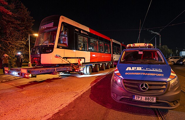 Do Prahy dorazila z plzeňské továrny první tramvaj zcela nového typu. Do Ústředních dílen DPP v Hostivaři ji dopravil obří tahač. (3. dubna 2025)