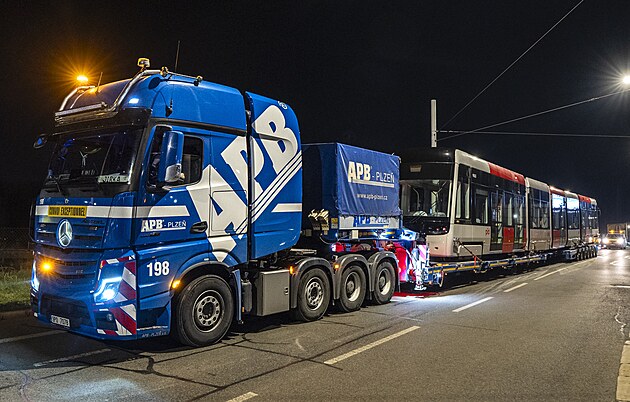 Do Prahy dorazila z plzeňské továrny první tramvaj zcela nového typu. Do Ústředních dílen DPP v Hostivaři ji dopravil obří tahač. (3. dubna 2025)