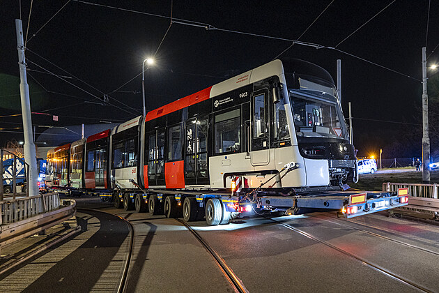 Do Prahy dorazila z plzeňské továrny první tramvaj zcela nového typu. Do Ústředních dílen DPP v Hostivaři ji dopravil obří tahač. (3. dubna 2025)