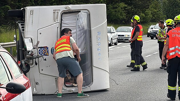 Dálnice D4 u Všenor stojí, starostovi Řeporyjí se převrhl obytný přívěs. (1. června 2025)