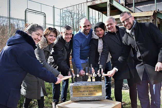 Společně s architekty z ateliéru Pavla Hniličky, kteří stavbu navrhli, poklepal starosta Prahy 6 Jakub Stárek základní kámen budoucí klubovny na Ořechovce. (15. března 2023)