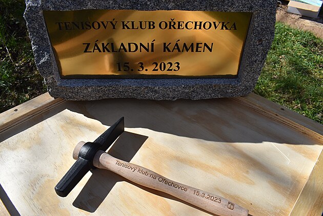 Společně s architekty z ateliéru Pavla Hniličky, kteří stavbu navrhli, poklepal starosta Prahy 6 Jakub Stárek základní kámen budoucí klubovny na Ořechovce. (15. března 2023)