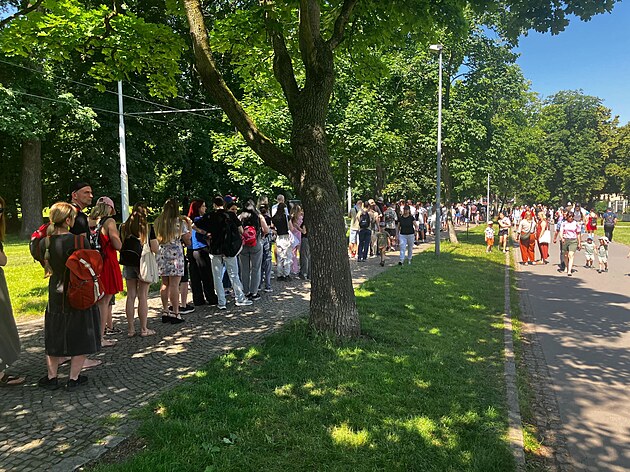 Lidé strojí frontu na návštěvu pražského planetária, které po modernizaci po dvou letech otevřelo. (14. června 2025)