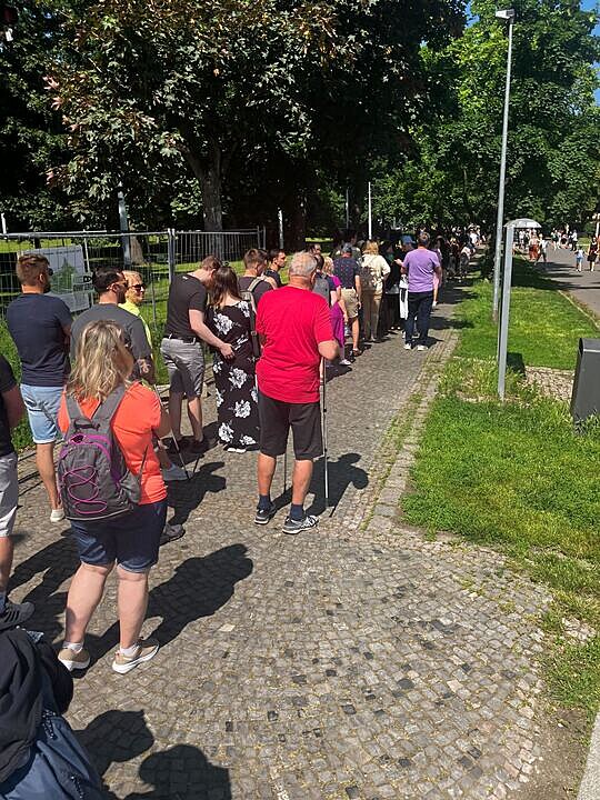 Lidé strojí frontu na návštěvu pražského planetária, které po modernizaci po dvou letech otevřelo. (14. června 2025)