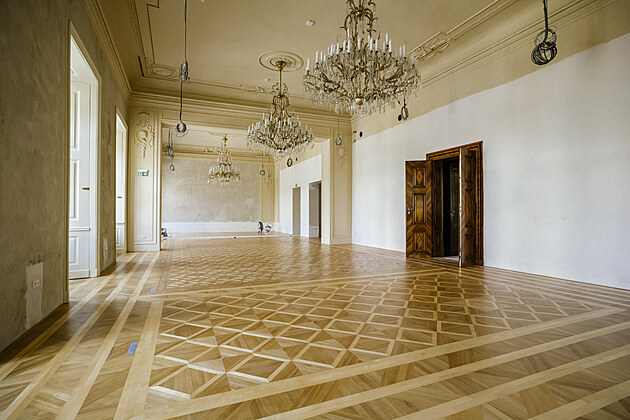 Obrazy místo rulety. V největším sále paláce bylo do začátku renovace kasino. Nově zde bude výstavní prostor. (23. prosince 2015)