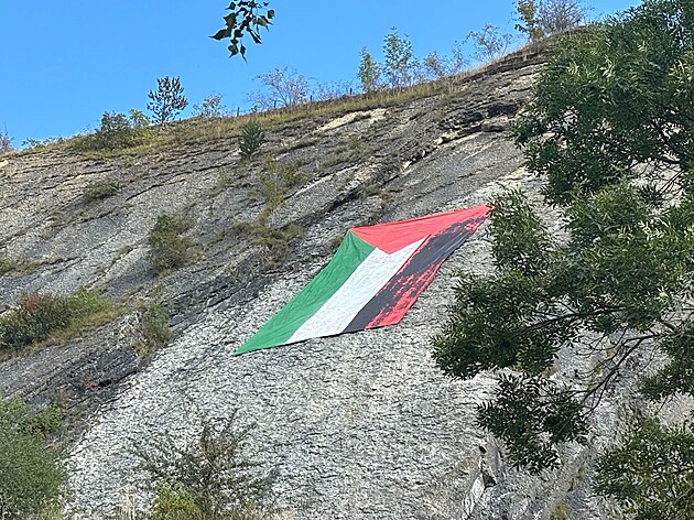 Velká palestinská vlajka na Branických skalách v Praze 4. (3. září 2025)