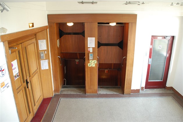 V budově právnické fakulty na Starém Městě je také jeden, má dvanáct kabin a vyroben byl už v roce 1929. Jenže kvůli špatnému technickému stavu od roku 2008 nejezdí.