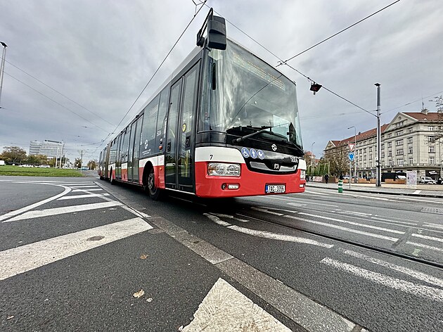 Autobusy PID mohou nově mohou jezdit po tramvajovém pásu středem křižovatky na Vítězném náměstí (22. října 2025).