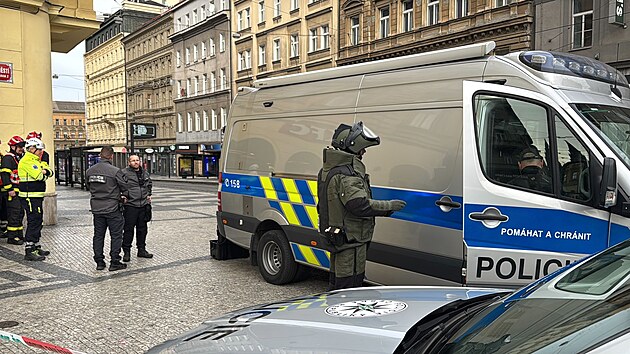Policejní manévry na I. P. Pavlova v Praze. Pyrotechnik zkoumá podezřelé zavazadlo. (25. září 2025)
