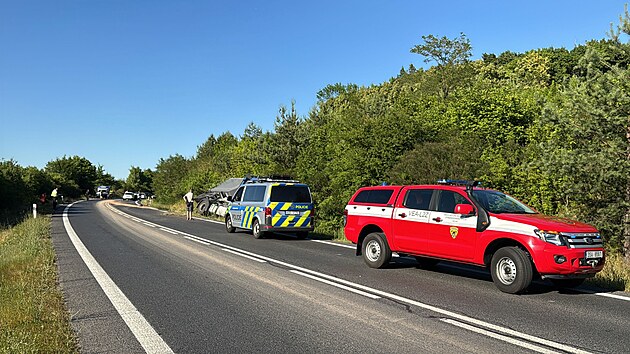 Silnici I/16 u obce Nová Ves na Mělnicku uzavřela dopravní nehoda. (1. července 2025)