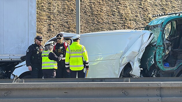 Na třetím kilometru Pražského okruhu u Vestce ve směru na D6 do sebe nabouraly dvě nákladní auta a dodávka. (6.3.2025)