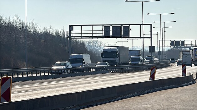 Na třetím kilometru Pražského okruhu u Vestce ve směru na D6 do sebe nabouraly dvě nákladní auta a dodávka. (6.3.2025)