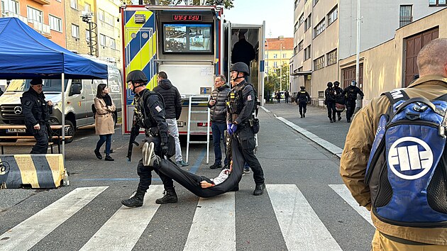 Na pražské střední zdravotnické škole v Praze 4 probíhá rozsáhlé cvičení složek integrovaného záchranného systému, které simuluje zásah při teroristickém útoku. (24. října 2024)