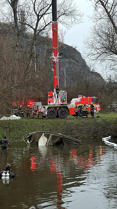 V pražské ulici Roztocká zasahovali hasiči u potopené lodi ve Vltavě. (10. prosince 2024)