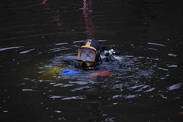 V pražské ulici Roztocká zasahovali hasiči u potopené lodi ve Vltavě. (10. prosince 2024)