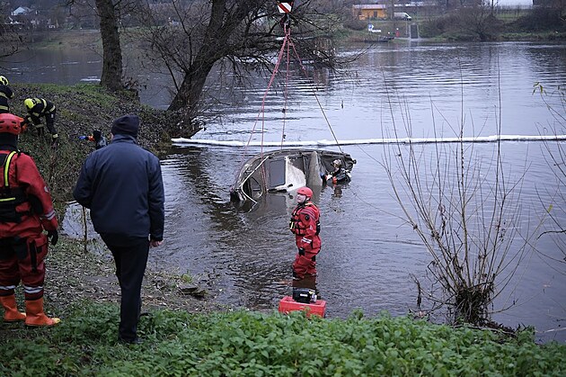 V pražské ulici Roztocká zasahovali hasiči u potopené lodi ve Vltavě. (10. prosince 2024)