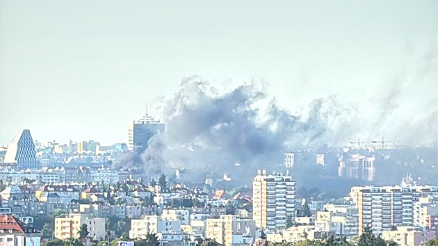 Požár střechy administrativní budovy ve Vinohradské ulici v Praze (25. června 2025)