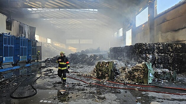 Středočeští hasiči zasahovali u požáru haly s třídící linkou odpadu (19. března 2024)