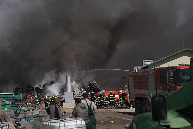 Hasiči v úterý pokračují v likvidaci obřího požáru skládky lisovaných plastů u Rynholce na Rakovnicku. (22. dubna 2025)
