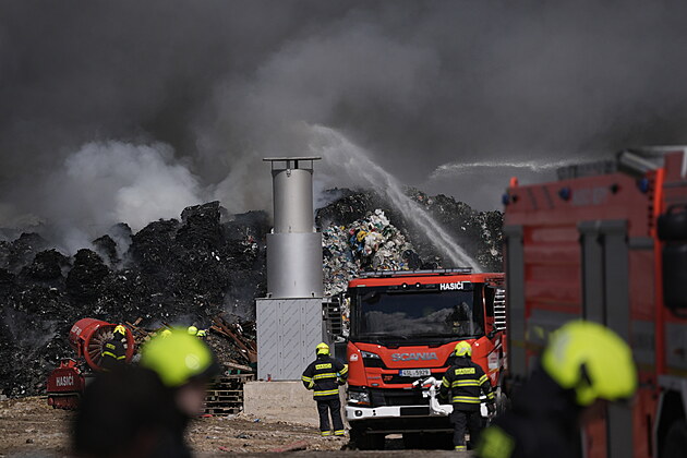 Hasiči v úterý pokračují v likvidaci obřího požáru skládky lisovaných plastů u Rynholce na Rakovnicku. (22. dubna 2025)