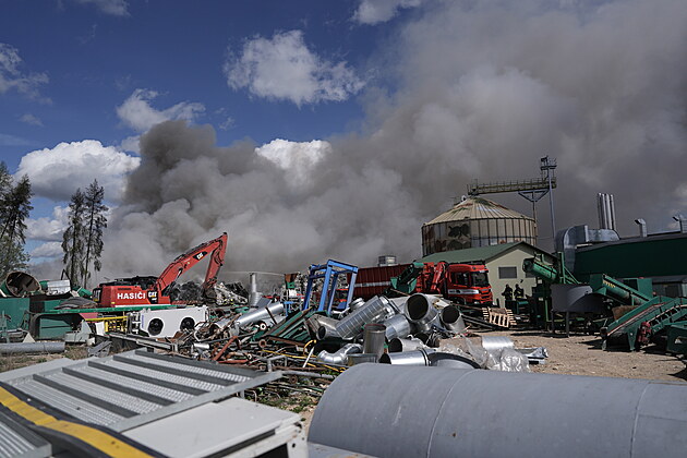 Hasiči v úterý pokračují v likvidaci obřího požáru skládky lisovaných plastů u Rynholce na Rakovnicku. (22. dubna 2025)