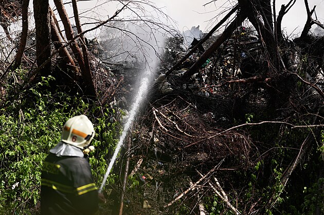 Hasiči v úterý pokračují v likvidaci obřího požáru skládky lisovaných plastů u Rynholce na Rakovnicku. (22. dubna 2025)