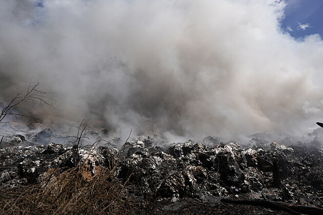 Hasiči v úterý pokračují v likvidaci obřího požáru skládky lisovaných plastů u Rynholce na Rakovnicku. (22. dubna 2025)