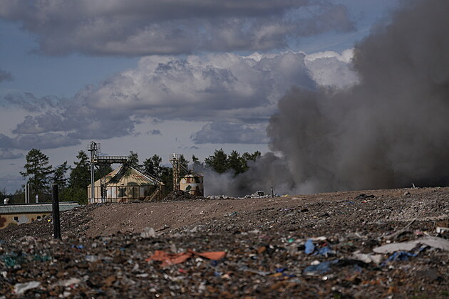 Hasiči pokračují v likvidaci obřího požáru skládky lisovaných plastů u Rynholce na Rakovnicku. (22. duben 2025)