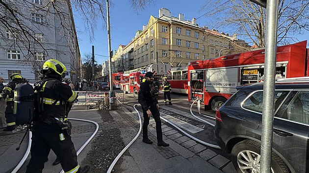 Pražští hasiči zasahují v ulici Jaromírova u požáru v restauraci, kde hoří vzduchotechnika. (23. prosince 2024)