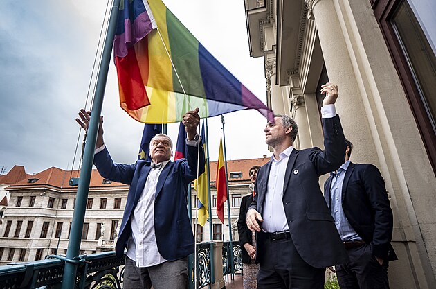 Primátor Bohuslav Svoboda a jeho první náměstek Zdeněk Hřib vyvěsili duhovou vlajku při příležitosti konání 15. ročníku festivalu Prague Pride.
