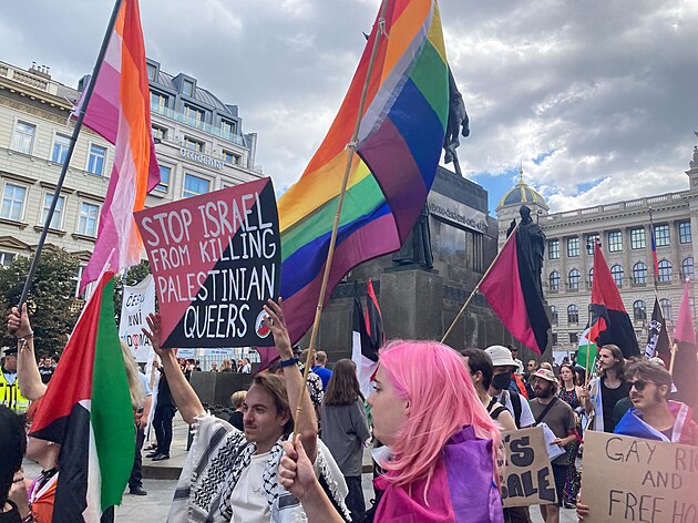 Na duhový průvod dorazili i zastánci Palestinců. Připojilo se jich zhruba padesát. (10. srpna 2024)