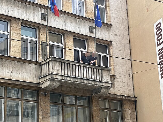 Zřízenci radnice odstraňují palestinskou vlajku. (28. května 2025)