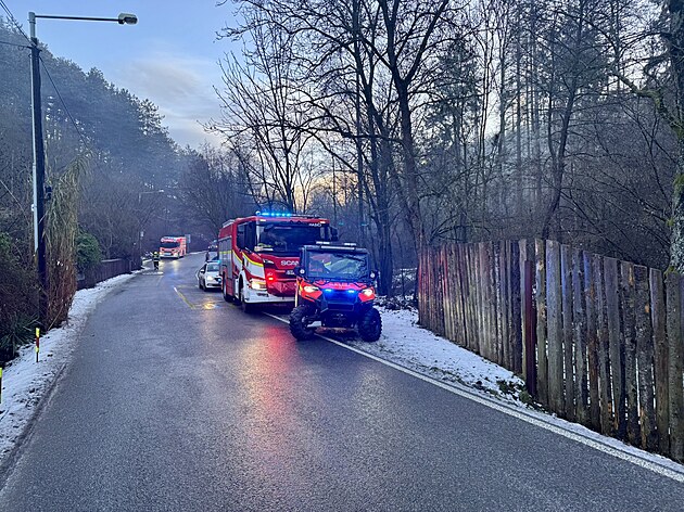 Autobus MHD sjel v Radotíně na ledovce do příkopu, vyprošťovali ho hasiči. (9. ledna 2025)