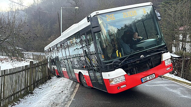 Autobus MHD sjel v Radotíně na ledovce do příkopu, vyprošťovali ho hasiči. (9. ledna 2025)