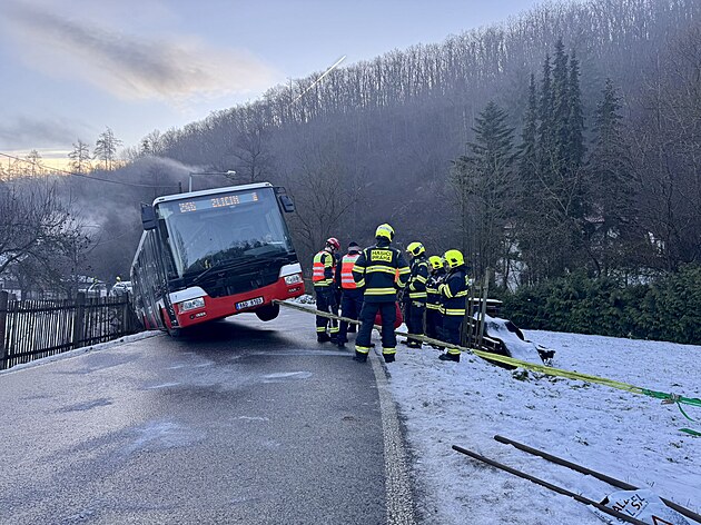 Autobus MHD sjel v Radotíně na ledovce do příkopu, vyprošťovali ho hasiči. (9. ledna 2025)