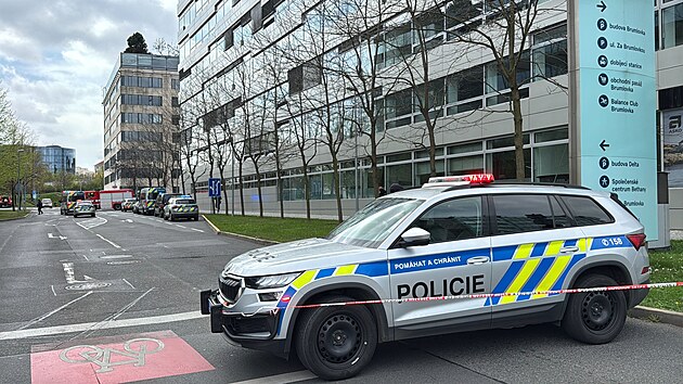 Policie vyjela k bankovnímu domu na Brumlovce kvůli výhružce výbušným zařízením. (15. dubna 2025)