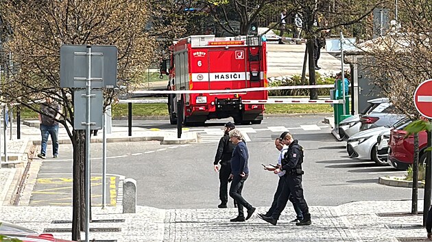 Policie vyjela k bankovnímu domu na Brumlovce kvůli výhružce výbušným zařízením. (15. dubna 2025)